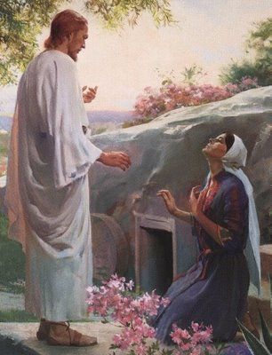 .… Ea statea afara lânga mormântul gol si plângea si plecându-se spre mormânt a vazut doi ingeri în veşminte albe, unde a fost trupul Lui Iisus. Îngerii au întrebat-o: Femeie, de ce plângi? Pe cine cauţi? Ea a răspuns: Că au luat pe Domnul meu şi nu ştiu unde L-au pus! Apoi întorcându-se înapoi a văzut pe Iisus, care a întrebat-o: Femeie, de ce plângi? Pe cine cauţi? Ea crezând ca este grădinarul, I-a zis: Doamne, dacă Tu L-ai luat, spune-mi unde L-ai pus şi eu Îl voi ridica! Iisus iarăşi i-a zis: Marie! Ea întorcându-se şi vazând ca este Iisus, a exclamat în evreieste: Rabuni! (adica Învaţătorule). Apoi Iisus a trimis-o la propovaduirea Evangheliei şi Maria Magdalena a mers şi a vestit ucenicilor că a văzut pe Domnul. (Ioan 20,11-18).